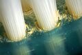 나일론(nylon) 칫솔모(bristle)는 화학약품에 견디는데 손잡이(handle)는 그렇지 않다. 칫솔모 반을 접어 금속침(metal staple)에 끼운 후 handle core속에 박는다.