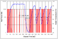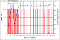 - 시간에 따른 표면 온도 및 소비전력. 온도 상승에 따라 저항온도계수에 의한 코일 저항이 상승하여 소비전력이 감소한다.