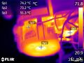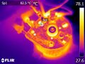 - 열화상카메라 온도. 화살표 지점 홈에 385 RTD 온도센서를 부착. 해당 지점 온도센서로는 92도인데 열화상 카메라로 가장 뜨거운 곳은 130도이다.